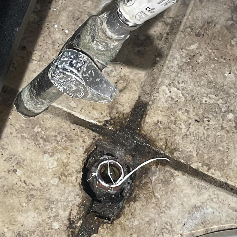 A plumber in Coatesville, Pennsylvania, removed a leaking ice maker line behind a refrigerator. The original shut-off valve had failed, causing water to drain into the basement. The faulty line was capped with a 1/4-inch brass cap to stop the leak. The plumber verified the repair was successful with a water test.