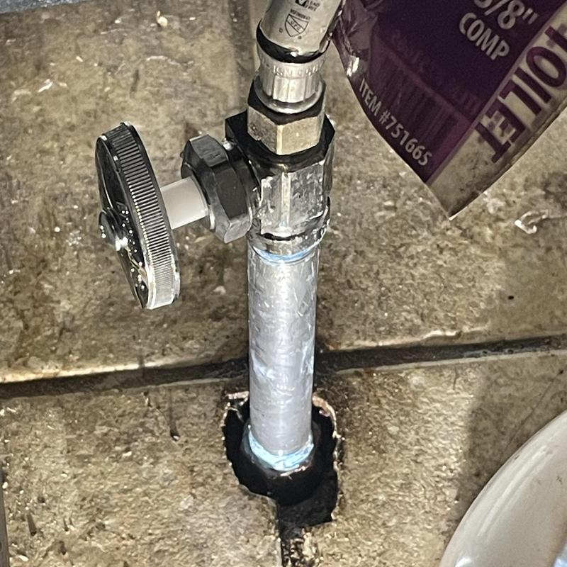 A plumber in Pottstown, Pennsylvania replaced a broken 38” chrome toilet supply nipple and installed a new shut-off valve. The old nipple had sheared at the threads. The plumber removed the damaged parts and completed testing to ensure proper function.