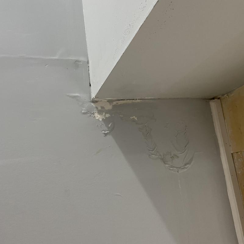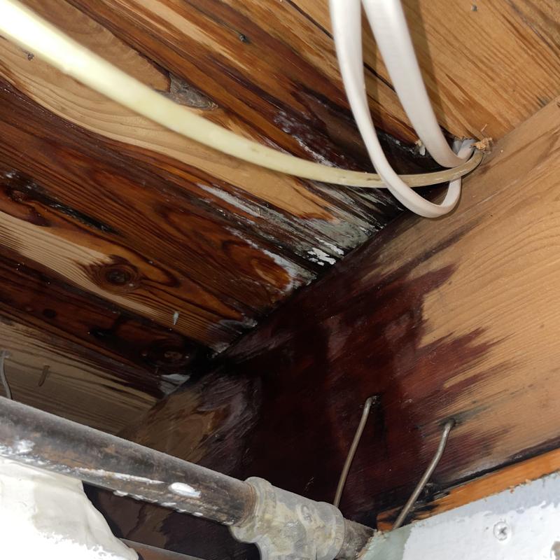 A plumber in Royersford, Pennsylvania located a leak in a hot water line above a laundry room. The plumber removed part of the ceiling, replaced a damaged copper pipe with a PEX section, and installed a new sharkbite coupler to eliminate further risk of leaks. The system tested without issues.