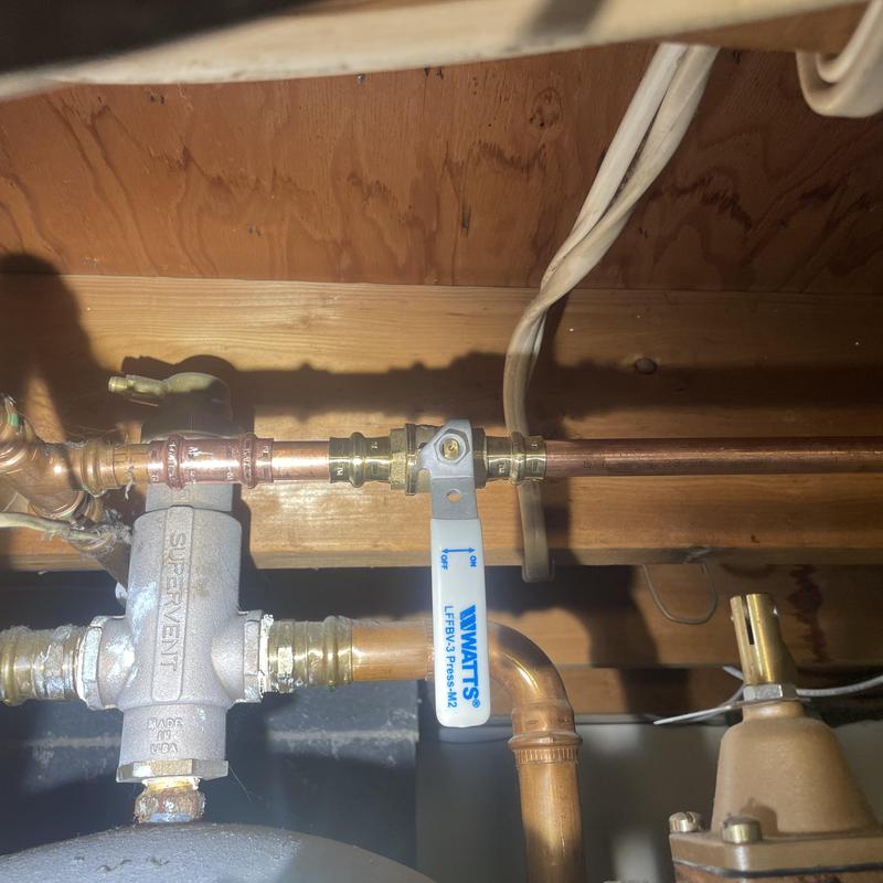 Drainmen Plumbing Inc replaced a leaking shut-off valve and brittle copper piping above an HVAC unit. They also installed a new pressure relief valve after the original one failed. The system tested successfully. This plumbing repair service took place in Pottstown, Pennsylvania.