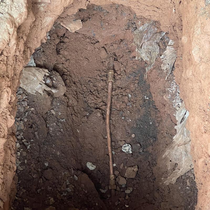 Drainmen Plumbing Inc repaired a main water line leak in Schwenksville, Pennsylvania. Technicians exposed and replaced two feet of ¾-inch copper pipe using two pressure couplings. After installation, they restored water service and verified the repair through testing.