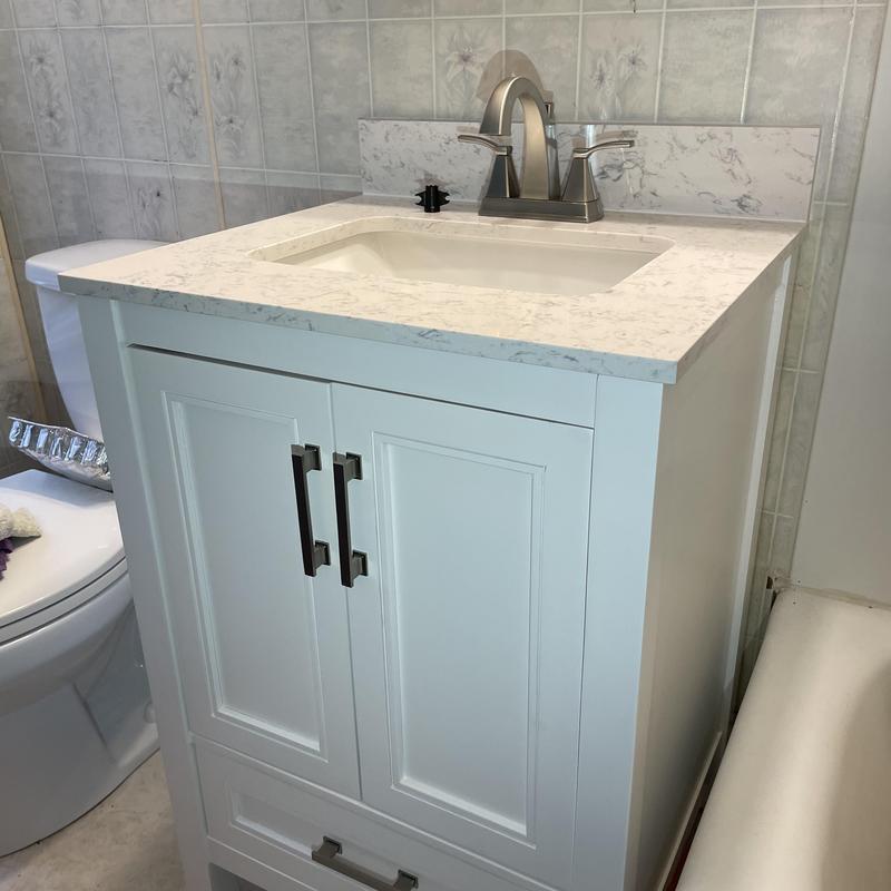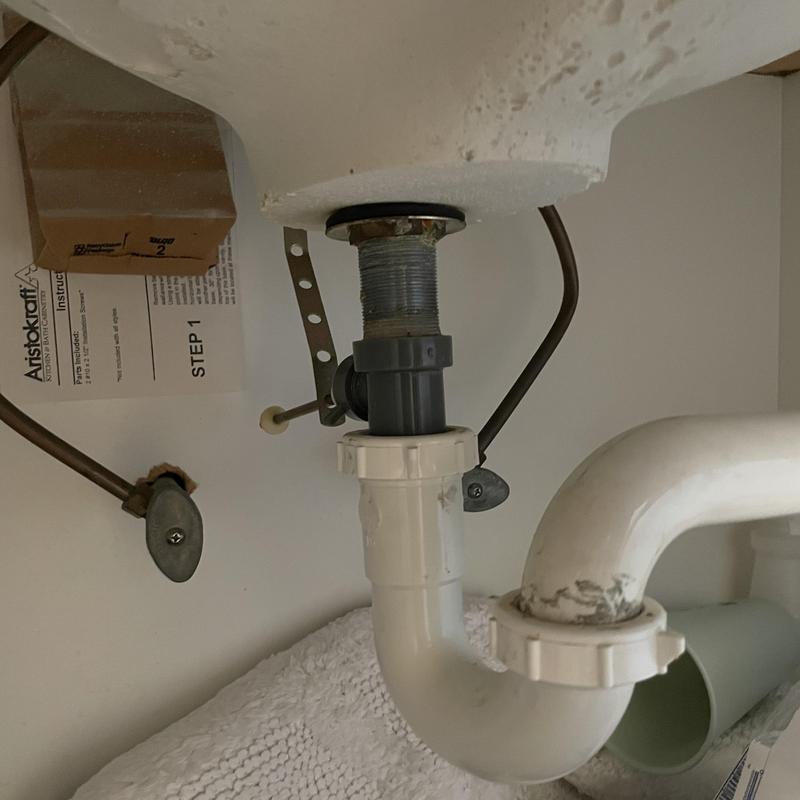 Drainmen Plumbing Inc installed a customer-supplied vanity and faucet in a second-floor bathroom in Pottstown, Pennsylvania. The team secured the vanity to the wall and adjusted the drain using a 45-degree offset to fit the new cabinet design. All components passed testing with no leaks.