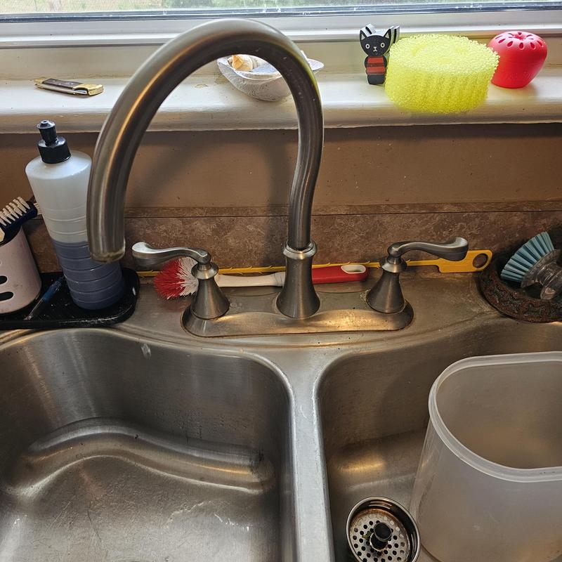 A plumber in Phoenixville, Pennsylvania replaced a leaking kitchen faucet with a new two-handle Moen faucet provided by the customer. The installation was completed successfully, and the faucet functioned properly after testing.