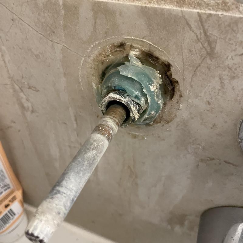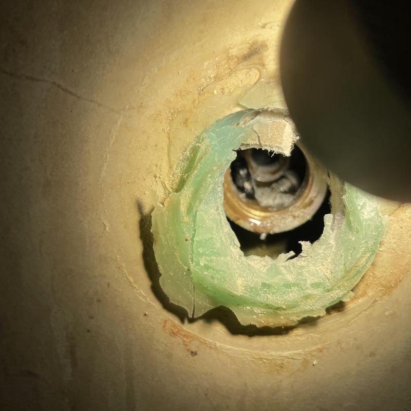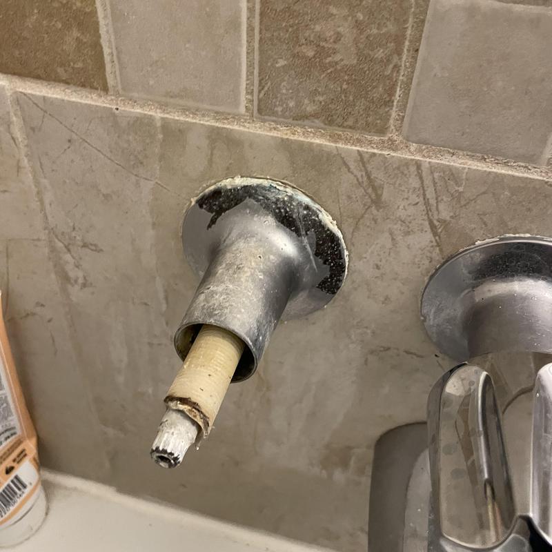 A plumber in Pottstown, Pennsylvania, replaced a leaking Moen Positemp cartridge in a bathtub. The leak had traveled behind the wall through the escutcheon. After installation and testing, the repair showed no further issues.