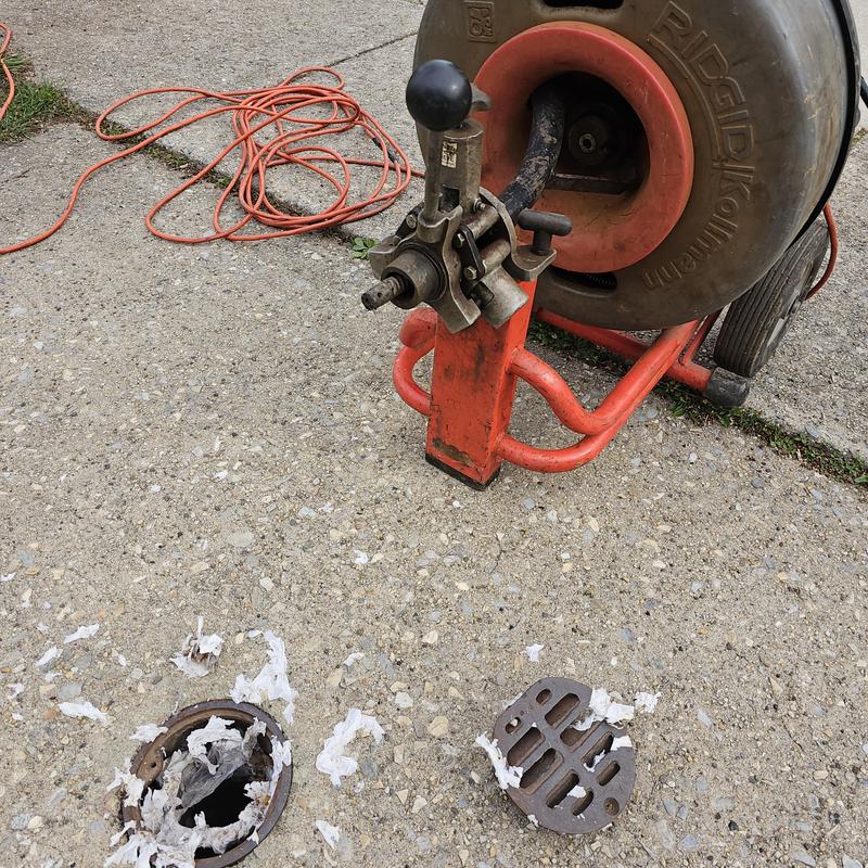 Drainmen Plumbing Inc cleared a main line clog at a residence in Norristown, Pennsylvania. The team used a drain snake through the cleanout to remove a blockage caused by toilet paper. Multiple passes were necessary to fully restore proper flow to the line.