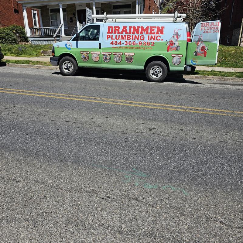 Drainmen Plumbing Inc cleared a clogged sewer line in Pottstown, Pennsylvania. The team used a drain snake to remove the blockage approximately 30 feet from the house. They also opened a toilet line that had been plugged. After clearing the system, they tested water flow and confirmed there were no backups.