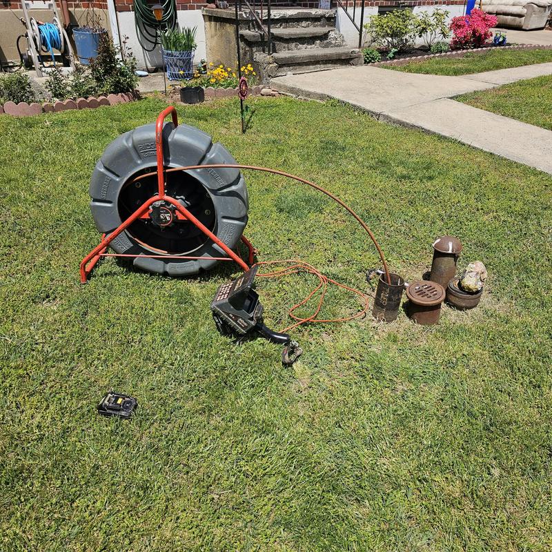 Drainmen Plumbing Inc cleared a clogged main sewer line in Norristown, Pennsylvania. The team located the outdoor cleanout in the front yard, used a drain snake to remove a blockage 45 feet from the house, and confirmed proper drainage by running water through the system.