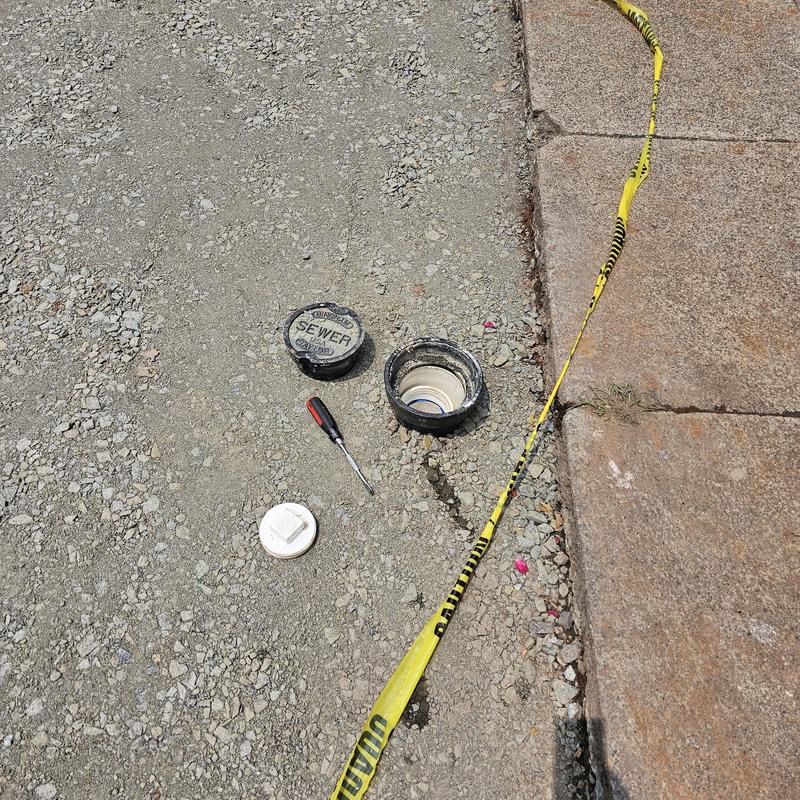 Drainmen Plumbing Inc cleared a clogged sewer line in Norristown, Pennsylvania. The team used a plunger to remove a blockage in the trap located near the curb. After clearing the line, they flushed toilets and ran sinks to ensure full drainage throughout the system.