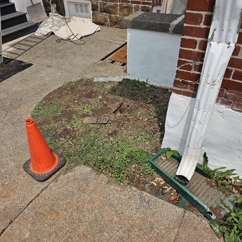 Drainmen Plumbing Inc evaluated a blocked underground downspout line in Coatesville, Pennsylvania. The customer previously had partial clearing completed and requested a second opinion. The team assessed the line, which ends in the front yard, and discussed an above-ground pipe option to redirect rainwater across the walkway.