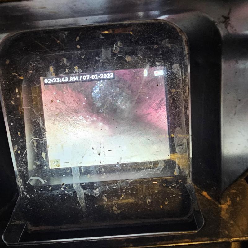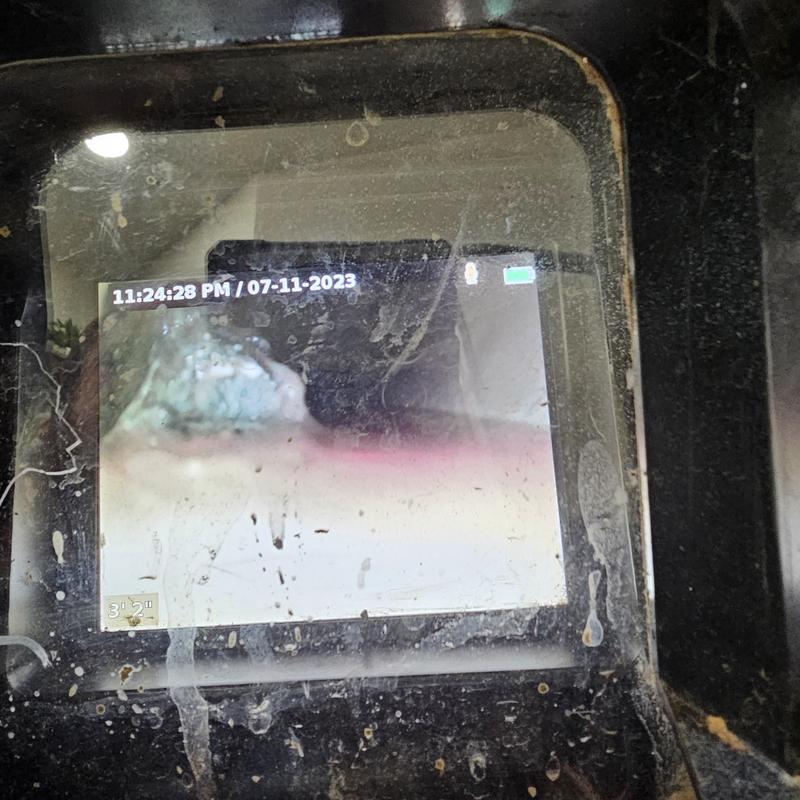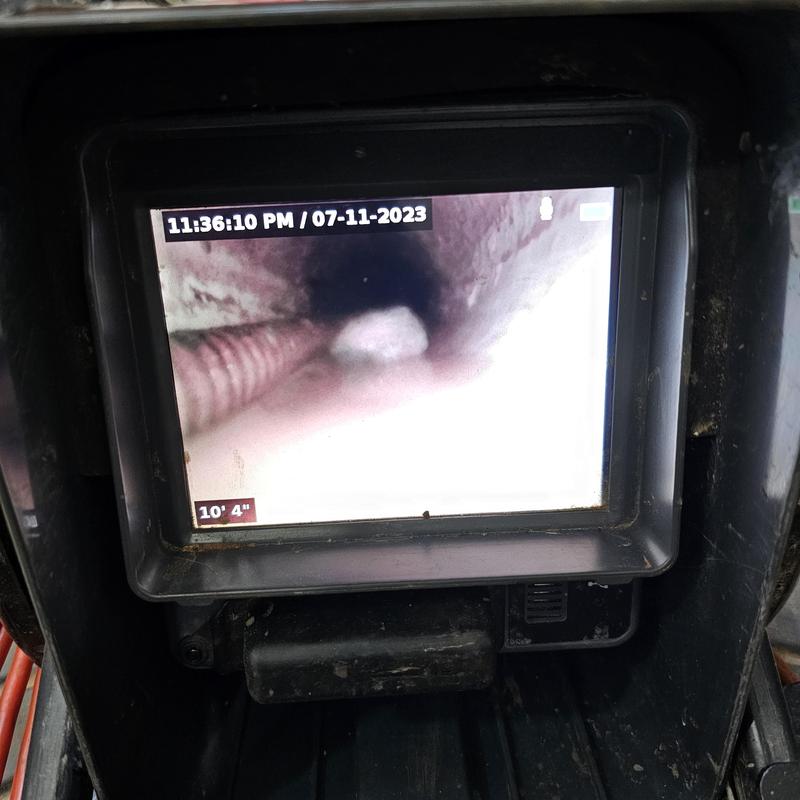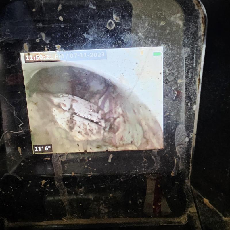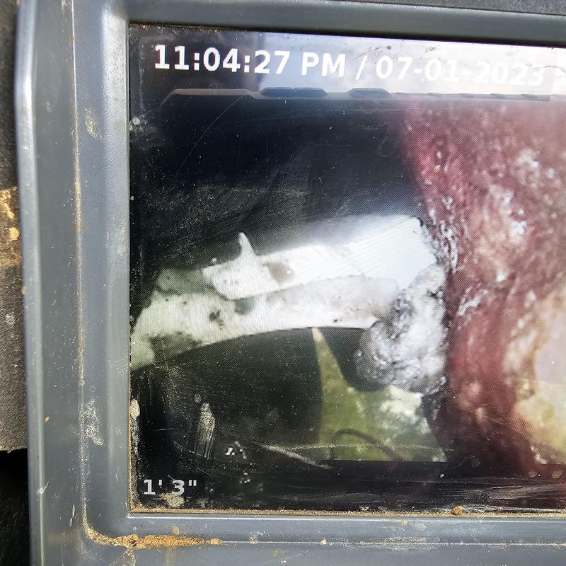 A plumber in King of Prussia, Pennsylvania cleared a backed-up main sewer line from a street-side cleanout. A camera inspection revealed a cleanout cap fragment inside the pipe. After running water through the system, the fragment dislodged and moved further into the main line, resolving the blockage.