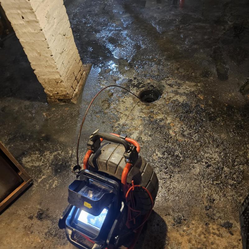Drainmen Plumbing Inc cleared a blocked floor drain at a residential property in Pottstown, Pennsylvania. Technicians used a high-pressure jetter to remove waste buildup near the foundation wall and restore proper drainage.
